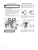 PRUEBA Y AJUSTE NOTA: Si el aparato está instalado a más de 8 pies (2,4 m), si se apunta el detector hacia abajo se reducirá la distancia de cobertura. El detector es menos sensible del movimiento que se dirige hacia él. 1. Prenda el cortacircuitos y el interruptor de luz. NOTA: El detector tiene un período de cerca de 1 1/2 minutos de calentamiento antes de detectar movimiento. Cuando lo prenda por primera vez, espere 1 1/2 minutos. Movimiento Movimiento 2.