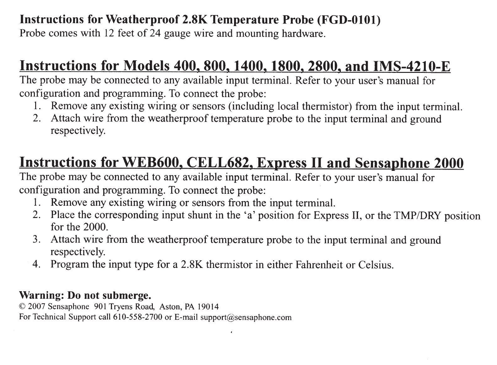 Instructions for Weatherproof 2.8K Temperature Probe (FGD-0101)