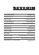 Kundendienstzentralen Service Centres Centrales service-après-vente Oficinas centrales del servicio Centros de serviço Centrale del servizio clienti Service-centrales Centrale serviceafdelinger Centrala kundtjänstplatser Keskushuollot Servisné stredisko Centrala obsługi klientów Szerviz Κεντρικ σ ρβις SEVERIN Service Am Brühl 27 59846 Sundern Telefon (02933) 982-460 Telefax (02933) 982-480 service@severin.de Ceská Republika Ambos Krusnohorská 788/61 CZ 36301 Ostrov uk. Varu Tel.
