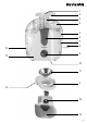 FI Mehulinko Hyvä Asiakas, Lue seuraavat ohjeet huolellisesti ennen laitteen käyttöä ja säilytä tämä opas tulevaa tarvetta varten. Laitetta saavat käyttää vain henkilöt, jotka ovat tutustuneet näihin ohjeisiin. Verkkoliitäntä Varmista, että verkkojännite vastaa laitteen arvokilpeen merkittyä jännitettä. Tämä tuote on kaikkien voimassa olevien CE-merkintöjä koskevien direktiivien mukainen. Osat 1. Syöttöpainin 2. Täyttösuojus 3. Syöttösuppilo 4. Kansi 5. Suodatinkannatin 6. Lukitsimet 7. Jätesäiliö 8.