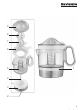∙∙ ∙∙ ∙∙ ∙∙ ∙∙ ∙∙ of the halves lightly down onto the dome with the cut section facing downwards. The drive shaft will start rotating automatically once pressure is applied to the dome. The appliance switches off when pressure on the dome is lifted. For better juice extraction, the motor can rotate in either direction and may also change direction during operation. When processing larger quantities of fruit, the pulp sieve must be emptied from time to time as necessary.