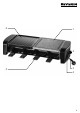 ∙ Efter brug drejes termostaten så langt til venstre som muligt og stikket tages ud af stikkontakten. Forberedelse af racletteost Beregn ca. 200-300g blød ost skåret i 3-5mm tykke skiver per person, og læg skiverne på de små pander. Racletteost og alpeost er særligt egnet. Praktiske anvisninger ∙ Frosne varer bør optøs før grilningen. ∙ For at undgå beskadigelse af belægningen på grillpladen og de små pander, bør der ikke benyttes skarpe køkkenredskaber.