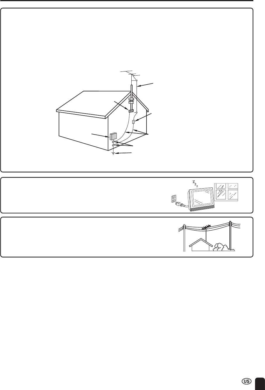 ■ If an outside antenna is connected to the television equipment, be sure the antenna system is