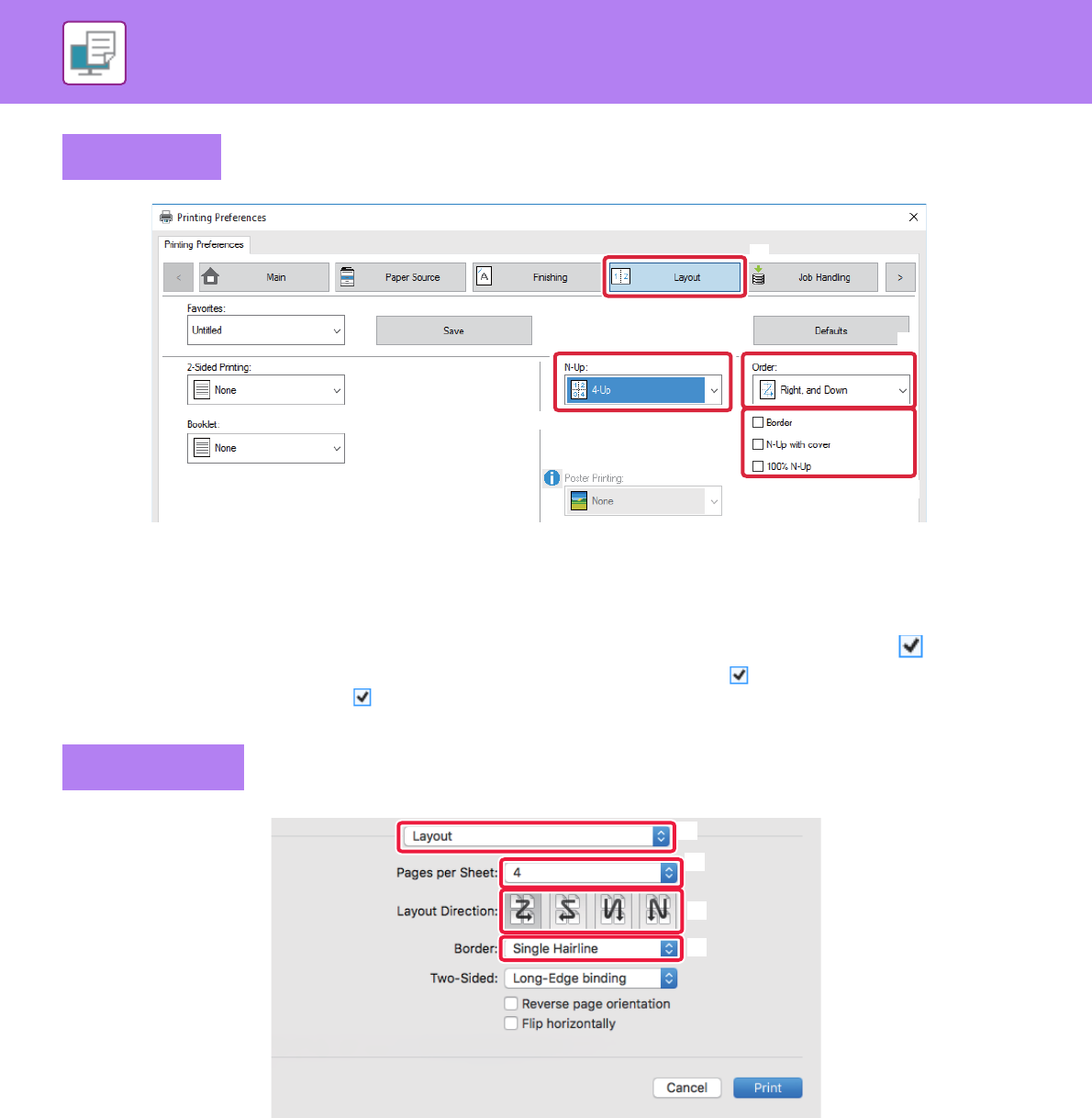 • To print the first page normally (as a cover), select the [N-Up with cover] checkbox ( ). (PCL6 only)