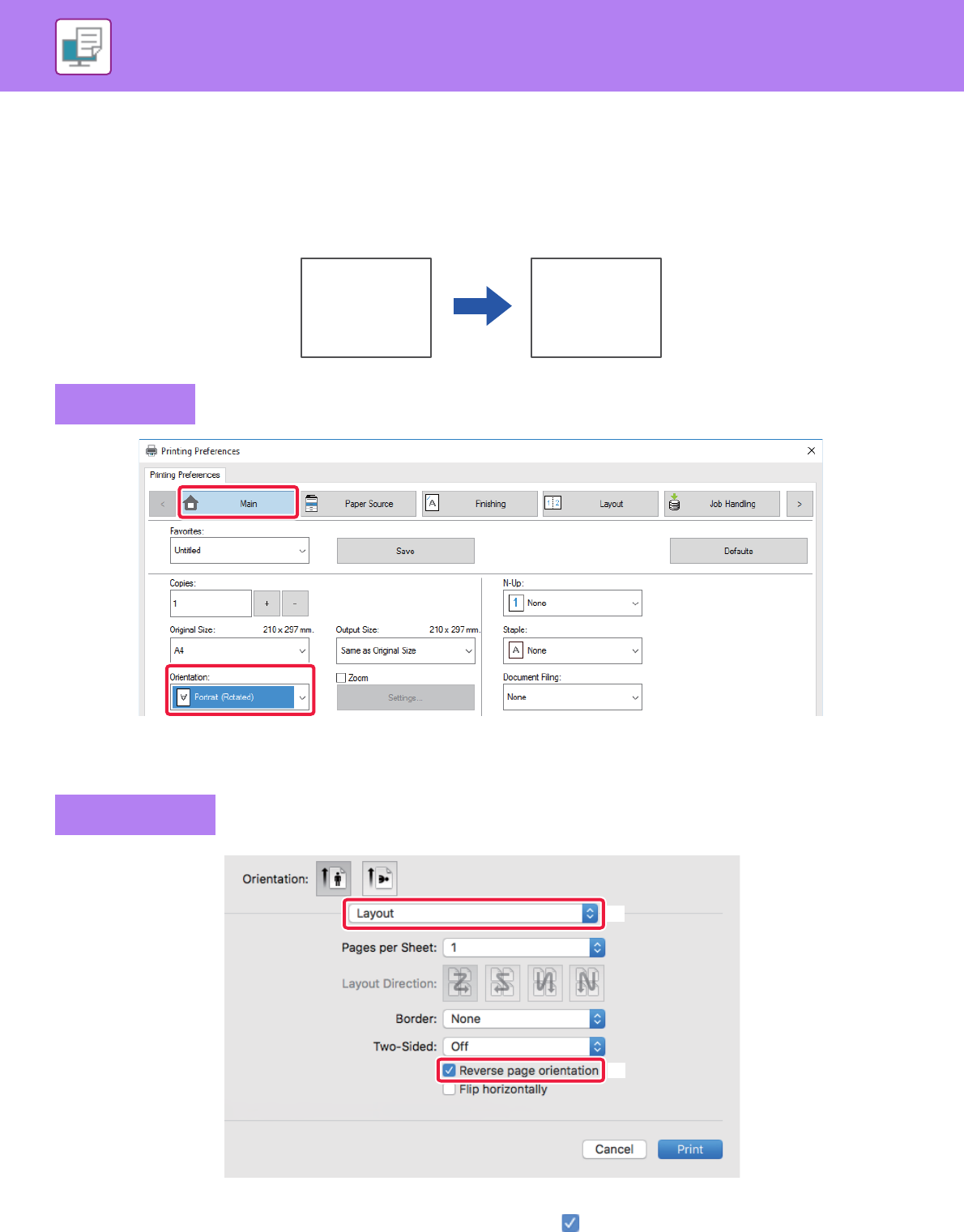(2) Select [Portrait (Rotated)] or [Landscape (Rotated)] in "Orientation".