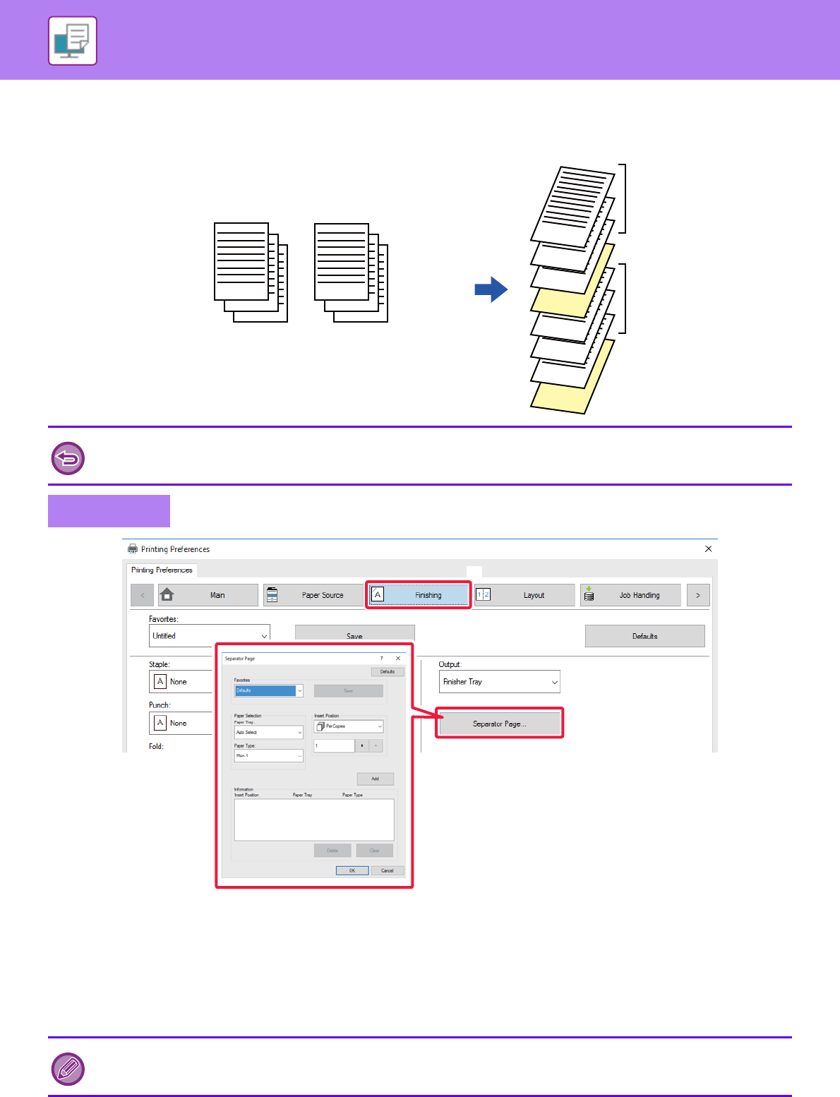 You can insert separator pages between jobs or the specified number of copies.