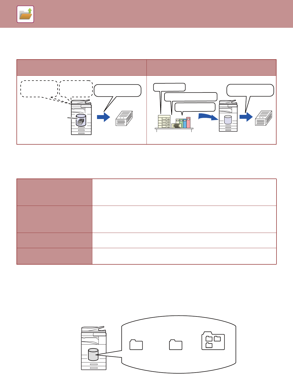 Three types of folders are used to store files on the hard drive using the document filing function.