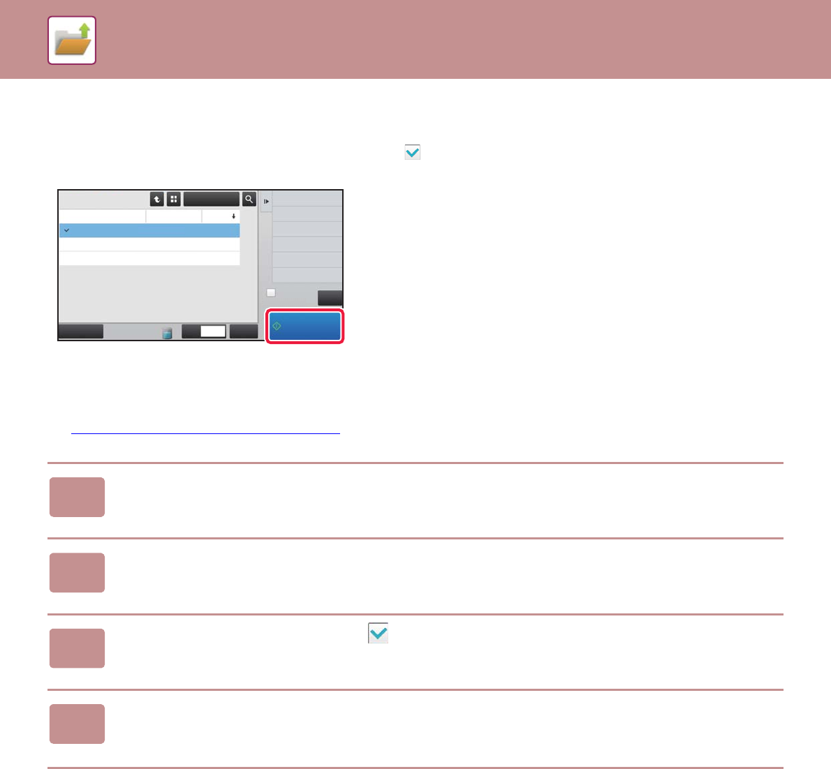 Prints a file with the various settings used when it was saved. Select a file and tap the [Print Now] key.