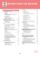 BEFORE USING THE MACHINE BEFORE USING THE MACHINE User Control . . . . . . . . . . . . . . . . . . . . . . . . . . . . . . 1-43 • User List . . . . . . . . . . . . . . . . . . . . . . . . . . . . . . 1-43 • Default Settings . . . . . . . . . . . . . . . . . . . . . . . . 1-47 • Administration Settings. . . . . . . . . . . . . . . . . . . 1-51 • Actions when the user is authenticated . . . . . . 1-52 PART NAMES AND FUNCTION . . . . . . . . . . . . . . . 1-3 • EXTERIOR . . . . . . . . . . . . . .
