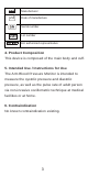 Manufacturer Date of manufacture Serial number LOT Lot number EU authorized representative 4. Product Composition This device is composed of the main body and cuff. 5. Intended Use / Instructions for Use The Arm Blood Pressure Monitor is intended to measure the systolic pressure and diastolic pressure, as well as the pulse rate of adult person via non-invasive oscillometric technique at medical facilities or at home. 6. Contraindication No known contraindication existing.