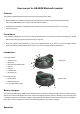 User manual for HB-390M Bluetooth headset Features: This headset supports Bluetooth and AUX (connection with 3.5mm audio cable). 1. Bluetooth Mode: The headset is adopted with CSR chipset and provides real stereo wireless transmission. The cell phone/Bluetooth device can pair and work with this headset. 2. AUX Mode: The headset is compatible with any audio device such as MP3 players, iPods…etc., through the AUX input port. Precautions: 1.