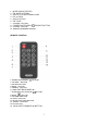 1. MODE INDICATOR LED 2. FM WIRE ANTENNA 3. AUX-IN 1 L/R RCA CONNECTORS 4. DC IN JACK 5. AUX-IN 2 JACK 6. FM TUNE + 7. VOLUME + BUTTON 8. POWER ON/STANDBY ; SOURCE BUTTON 9. VOLUME - BUTTON 10. REMOTE INFRARED SENSOR REMOTE CONTROL 1. POWER ON/STANDBY BUTTON 2. VOLUME – BUTTON 3. SOURCE BUTTON 4. BASS – BUTTON 5. TREBLE – BUTTON 6. TUNE-/SKIP BACKWARD 7. BLUETOOTH PLAY/PAUSE BUTTON 8. MUTE BUTTON 9. VOLUME + BUTTON 10. BASS + BUTTON 11. BLUETOOTH PAIR BUTTON 12. TREBLE + BUTTON 13. EQ BUTTON 14.