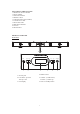 INCLUDED IN THIS PACKAGE 1 x Bluetooth® Stereo Soundbar 1 x Power adapter 1 x Instruction manual 1 x Remote control 1 x CR 2025 button cell (included) 1 x 3.5mm aux in cable 1 x RCA audio cable 2 x Wall mount brackets 4 x Screws 4 x Wall anchors PRODUCT OVERVIEW Front View AUX AUX TUN- TUN+ 1 2 VOL- TUN- TUN+ VOL+ SOURCE VOL- 3 4 VOL+ 5 1. AUX IN jack 4. Remote sensor 2. Tune down / previous Tune up / next 3. LCD display 5. Volume - (volume down) Volume + (volume up) 6.