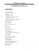 PT6500-02 User’s Manual PT6500-02 User’s Manual CONTENTS ■ Unpacking and checking ◆ Supplied accessories ■ Preparation ◆ Charging the battery ◆ Installing/Removing the battery pack ◆ Installing the antenna ◆ Installing the optional speaker/microphone ◆ Installing the belt clip ■ Getting acquainted ■ Basic Operation ■ Programmable Button functions ■ VOX ■ Copy mode ■ Whole setting ◆ Time-out Timer(TOT) ◆ Battery Saving ◆ Low battery warning ◆ Voice Annunciation of Channel Number ◆ CTCSS/ DCS ■ User’s resol