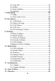 3-5 Delete Call Logs 3-6 Call Timers 3-7 Call Cost 3-8 Text message counter 4 Settings 4-1 Phone Settings 4-2 Mode Setting 4-3 Network Settings 4-4 Security Settings 4-5 Call Settings 4-6 Restore Factory Settings 5 Multimedia 5-1File manager 5-2 Audio Player 5-3 Camera 5-4 Image Viewer 5-5 Video Player 5-6 Video recorder 5-7 FM Radio 6 Fun & Games 6-1 Games 6-2 Game Setting 7 User Profiles 7-1 General 7-2 Meeting 7-3 Outdoor 7-4 Indoor 7-5 Headset 8 Services 9 Organizer 21