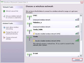 3.2.4 Select “Tenda” and click “Connect” or double-click “Tenda”