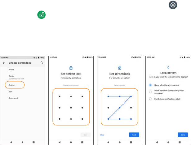 • Pattern: Tap to set an unlock pattern. Follow the prompts to nish the settings.