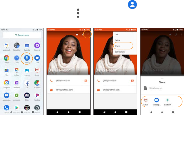 You can quickly share contacts using Bluetooth, Gmail, or text messaging.