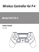 取扱説明書 商品概要 本コントローラーはP4コントローラーであり、ワイヤレスブルートゥ ースコントローラーに属します。遠距離で操作できるし、遅延もあり ません。P4本体、P4 PRO、P4 SLIMに適応だけでなく、PC、x-input (PC360)に関するPCゲームも対応します。 製品パラメータ 電圧:DC 3.6-4.2V スタンバイ電流:0uA 使用時間(満充電):10-12h 充電時間:2-3h 充電電流:>350mA Bluetooth距離:<10m 動作電流:<55mA バッテリー容量:600mAh 重量:221.6g 脈動電流:80-100mA USB長さ:1m サイズ:16.0 x 13.0 x 6.