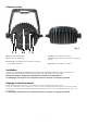Panneau arrière Fig. 2 3 4 56 7 8 3) Entrée DMX à 3 broches 4) Sortie DMX à 3 broches 6) Œillet pour câble de sécurité 7) Sortie IEC (permet de connecter jusqu’à 15 unités) 5) Affichage LCD Display avec boutons de menu + connexion à la terre 8) Entrée IEC + fusible 1 A / 250 V Installation Retirez tout le matériel d’emballage du Compact Par 18 Tri MKII. Veillez à ce que la mousse et le plastique de rembourrage soient complètement retirés. Branchez tous les câbles.