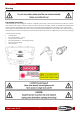 X-Terminator • • • • • • • • • • • • • • • • • • • • • • Always check and position the laser before anybody enters the room, when the laser is facing an area with people Always keep case closed while operating. Always allow free air space of at least 50 cm around the unit for ventilation. Always disconnect power from the mains, when device is not used or before cleaning! Only handle the power cord by the plug. Never pull out the plug by tugging the power cord.