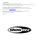 • • • • • • • If device is dropped or struck, disconnect mains power supply immediately. Have a qualified engineer inspect for safety before operating. If the device has been exposed to drastic temperature fluctuation (e.g. after transportation), do not switch it on immediately. The arising condensation water might damage your device. Leave the device switched off until it has reached room temperature. If your Showtec device fails to work properly, discontinue use immediately.