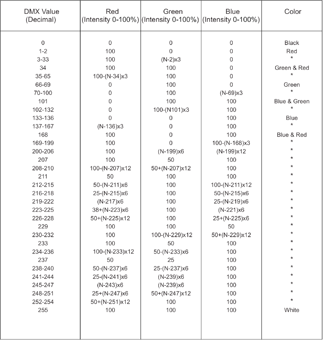For example: If the DMX value is 239, Red intensity is 50-(239-237)x6=38%,