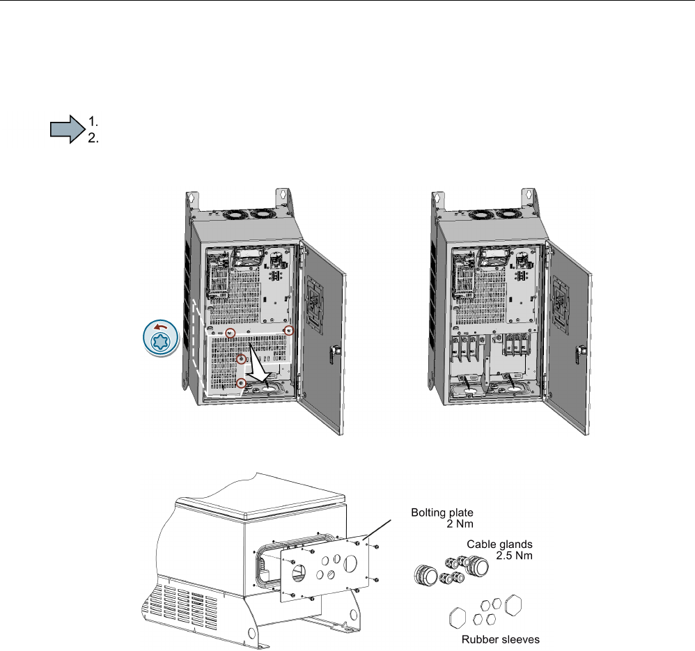 6. Secure the bolting plate to the inverter enclosure. Tightening torque 2 Nm.