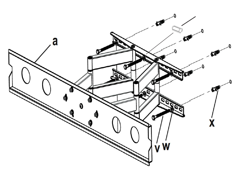 7. Insert lag bolts (v) and washers (w) into the concrete anchors as shown and tighten. Do