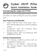 Cyber 2S1P PCIe Quick Installation Guide Introducing the Cyber 2S1P PCIe The Cyber 2S1P PCIe high-speed serial I/O card provides two 9-pin serial ports and one parallel port. Key Features and Benefits • • • Adds 2 RS-232 9-pin serial ports and 1 ECP/EPP parallel port to your PCIe enabled system Compliant with PCI Express Base Specification, Revision 1.
