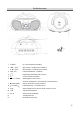 Bedienelemente 5 12 13 1. POWER Ein-/Ausschalttaste (Standby) 2. l / TUN- Skip zurück / Sendersuche rückwärts l / TUN+ Skip vorwärts / Sendersuche vorwärts 3. FUN / EQ Funktionswahltaste / Equalizer 4. Kopfhöreranschlussbuchse (3,5 mm) 5. CD-Fach öffnen/schließen 6. ll / P+/SCAN Wiedergabe-/Pause-Taste / nächster Senderplatz / automatischer Senderspeicher 7. / REP / MEM Stopp / Wiederhol- / Speicherfunktion 8. Lautstärke leiser / Lautstärke lauter VOLUME 9.