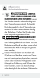 Allgemeine Sicherheitshinweise LEBENSUND UNFALLGEFAHR FÜR KLEINKINDER UND KINDER! Lassen Sie Kinder niemals unbeaufsichtigt mit dem Verpackungsmaterial. Es besteht Erstickungsgefahr durch Verpackungsmaterial. Kinder unterschätzen häufig die Gefahren. Halten Sie Kinder stets vom Verpackungsmaterial fern. LEBENSGEFAHR! Batterien können verschluckt werden, was lebensgefährlich sein kann. Ist eine Batterie verschluckt worden, muss sofort medizinische Hilfe in Anspruch genommen werden.