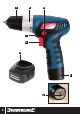 ESP Presentación del producto 1 Portabrocas 2 Manguito 3 Inversor del sentido de giro 4 Batería 5 Indicador de nivel de carga de batería 6 Interruptor de gatillo 7 Luz de guía LED 8 Cargador Desembalaje • Desembale e inspeccione la herramienta con cuidado. Familiarícese con todas sus características y funciones. • Asegúrese de que el embalaje contiene todas las partes y que están en buenas condiciones.