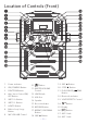 Location of Controls (Front) ao ap aq ar as bt bk bl bm bn bo bp bq br u v w x y U V W X at ak al am an 1. Power indicator 2. ON/STANDBY Button 10. Button 3. FUNCTION Button 11. MASTER VOLUME Control 4. Auto Voice Control ON/ OFF Button 12. LINE IN Jack 5. SKIP 10+ Button 6. SKIP 10- Button 7. LIGHTS Button 8. Built-in loop Songs Button 9. MIC VOLUME Control 13. USB Slot 14. Speaker 19. SKIP : Button 20. STOP < Button 21. PLAY/PAUSE Button 22. Bluetooth indicator 23.