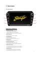 • Press to turn on and zoom in while playing DVD. You can zoom in up to 3x. (No all DVD disc supports this function) [AUDIO] Button • Press to switch the AUDIO channel of the disc while playing DVD. [SUB-T] Button • Press to switch next available subtitle while playing DVD. • Press to display Video menu in iPod mode. [ANGLE] Button • Press to switch the different ANGLE while playing DVD. (No all DVD disc supports this function) • Press to display Audio menu in iPod mode. 2 Basic operations 2.