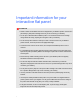 Important information for your interactive flat panel WARNING l Failure to follow the installation instructions shipped with your SMART product could result in personal injury and product damage which may not be covered by your warranty. l Do not open or disassemble the SMART product. You risk electrical shock from the high voltage inside the casing. Opening the casing also voids your warranty. l Do not stand (or allow children to stand) on a chair to touch the surface of your SMART product.