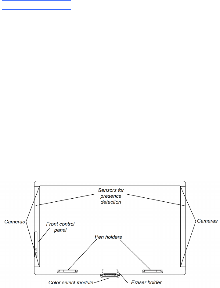 The front of your interactive flat panel includes the LCD screen, the cameras and reflective tape