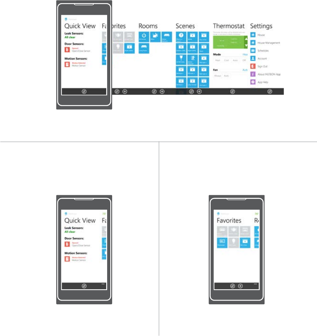 The INSTEON app on Windows Phone uses a six-screen carousel to switch between Quick View, Favorites,