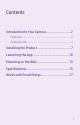 - Contents Introduction to Your Camera............................... 2 Features.........................................................................2 Components................................................................. 4 Installing the Product.......................................... 7 Launching the App ............................................. 10 Mounting on the Wall......................................... 13 Specifications......................................................