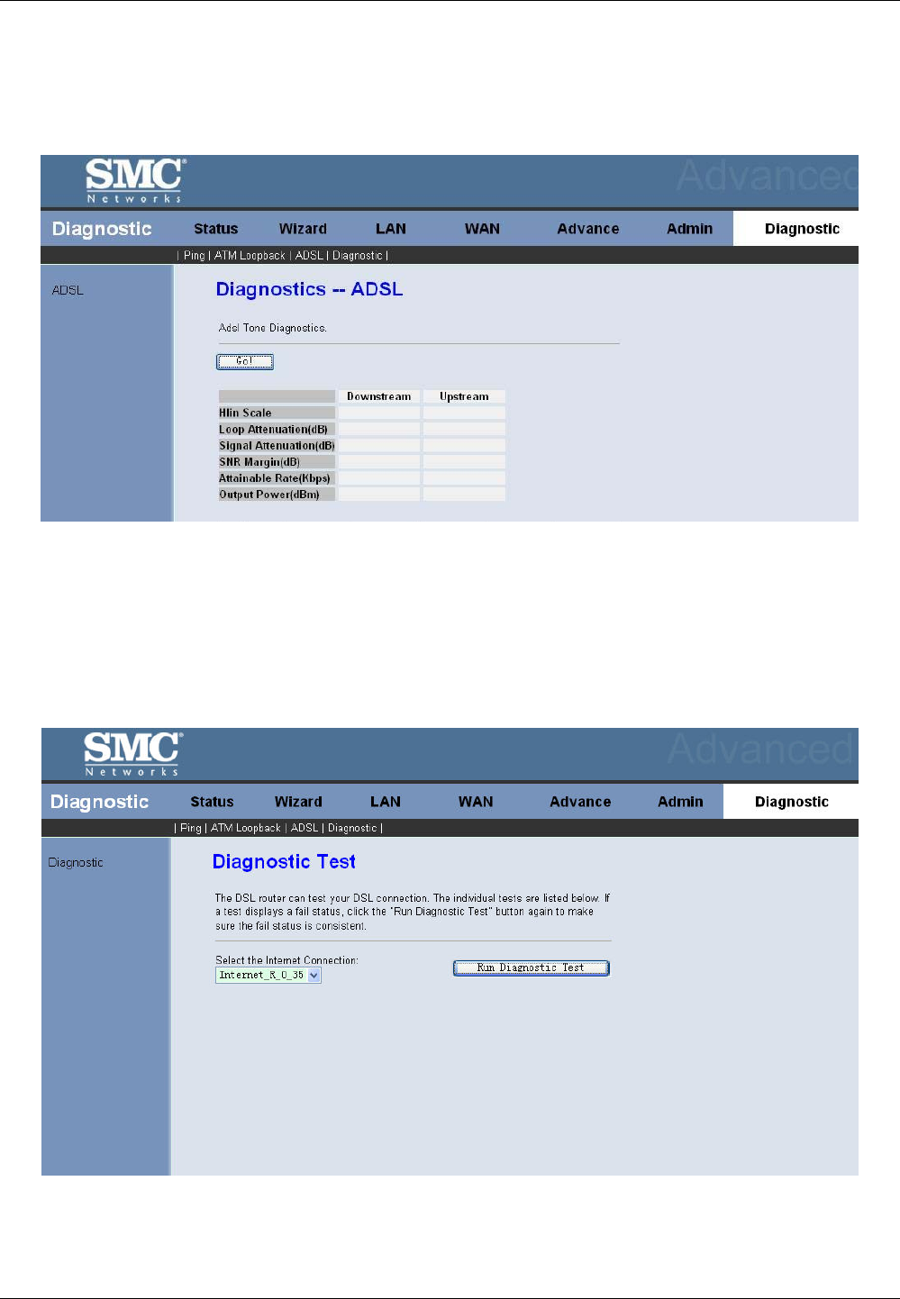 Click Diagnostic in the sub-menu to open the screen of Fig 3.8.4. This page is used for testing your DSL
