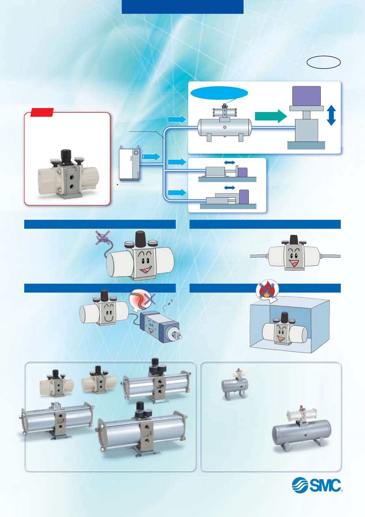 Booster Regulator/Air Tank New Increase factory air pressure by up to 4 times! Air-only operation requires no power supply, reduces heat generation, and Boost pressure allows easy installation. NEW Renewed model with pressure increase ratio 2 to 4 times (VBA11A) RoHS Heavy 0.6 MPa 0.3 MPa Factory line Booster Regulator + Air Tank 0.3 MPa 0.3 MPa Light Compressor 0.3 MPa Light No power supply or wiring needed There is no need to install dedicated electrical wiring.
