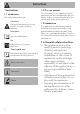 Instructions 1 Instructions 1.1 Introduction Key information for the user: Instructions General information on this user manual, on safety and final disposal. Description Appliance description Use Information on using your appliance. Cleaning and care Information for proper cleaning and maintenance of the appliance. Safety instructions Information Advice 4 1.