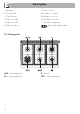 Use Racks and trays 3.3 Using the hob Racks and trays have to be inserted into the side guides until they come to a complete stop. • The mechanical safety locks that prevent the rack from being taken out accidentally have to face downwards and towards the oven back. All the appliance’s control and monitoring devices are located together on the front panel. The burner controlled by each knob is shown next to the knob. The appliance is equipped with an electronic ignition device.