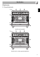 Beskrivelse 1 Kantliste 2 Kogeplade 3 Betjeningspanel 4 Venstre lampe 5 Tætningsliste 6 Låge 7 Ventilator 8 Opbevaringsrum 9 Stik til temperatursonde Støtterammer til riste/bradepander 2.