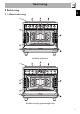 Beskrivning 1 List 2 Spishäll 3 Kontrollpanel 4 Vänster lampa 5 Tätning 6 Lucka 7 Fläkt 8 Förvaringsutrymme 9 Uttag till temperatursond Stödramar galler/plåtar 2.