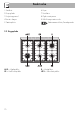 Beskrivelse DA 2.3 Betjeningspanel Modeller med minuttæller Modeller med ur med programmeringsfunktion 1 Knapper til kogepladens blus 3 Temperaturknap Anvendes til at tænde og indstille kogepladens blus. Tryk på og drej knapperne mod urets retning til værdien for at tænde de tilhørende blus. Drej knapperne i området mellem maksimum og minimum for at indstille flammen. Ved hjælp af denne knap er det muligt at vælge tilberedningstemperaturen.