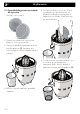 IT Użytkowanie Części w ruchu Niebezpieczeństwo obrażeń lub uszkodzenia urządzenia • Nie uruchamiać wyciskarki do cytrusów przez dłużej niż 3 minuty. Przed ponownym uruchomieniem poczekać ok. 15 minut, aż ostygnie. • Nie wkładać palców, widelców lub łyżek do dziubka. Mogłoby to doprowadzić do obrażeń lub uszkodzenia urządzenia. • Należy trzymać ręce, włosy, łańcuszki, krawaty, łyżki lub inne przedmioty z dala od stożka i filtra, aby uniknąć obrażeń ciała lub uszkodzenia urządzenia.