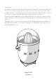 Inhoudsopgave 1.1 1.2 1.3 1.4 1.5 1.6 1.7 Inleiding Deze gebruiksaanwijzing Gebruiksbestemming Algemene veiligheidswaarschuwingen Aansprakelijkheid van de fabrikant Typeplaatje Verwerking 2 Beschrijving 2.1 Beschrijving van het product 3 Gebruik 3.1 Vóór het eerste gebruik 3.2 De citruspers in elkaar zetten 3.3 Gebruik van de citruspers 4 Reiniging en onderhoud 4.1 Waarschuwingen 4.2 Reiniging van de motor 4.