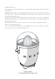 Использование 3.3 Порядок работы 1. Разрежьте цитрус пополам. 5. Прижмите половинку цитруса к конусу и следя за тем, чтобы носик оставался открытым. Двигатель запустится автоматически. 2. Установите соковыжималку на сухую и ровную поверхность. 3. Откройте носик (5), опустив его, и подставьте под него стакан или другую ёмкость. 6. После отжима сока снимите корку с конуса для автоматической остановки двигателя и закройте носик (5). 4. Подсоедините шнур к розетке электрической сети.