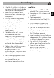 Installation 5. Tilpas bunden af fastgørelsesbeslaget helt til jorden, og stram skruerne for at fastgøre målene. 6. Tag højde for afstanden på 50 mm fra siden af apparatet til hullerne i beslaget. 128 7. Skub beslaget på væggen og indtegn placeringen af hullerne, der skal udbores i muren. 8. Efter udførsel af hullerne i væggen, skal man bruge rawplugs med skruer for at fastgøre beslaget til muren. 9. Skub komfuret mod væggen, og indsæt samtidigt beslaget i pladen, som er fastgjort bag på apparatet.